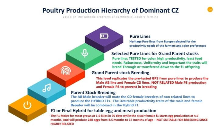 Ano po ba Dominant CZ?Ang Dominant CZ ay isang genetics company sa Czech Republic, Europe. Mula 1989, sila ay supplier ng matitibay at produktibong manok base sa Heritage Lines ng Europe. Hindi po ito pangalan ng manok.Ang company na ito ay nag-po-produce sa pamamagitan ng natural breeding selection (na walang GMO) para mag-produce ng unipormeng lahi ng mga manok na base sa European Heritage Lines katulad ng Rhode Island Red, Rhode Island White, Sussex, White Leghorn, Brown Leghorn, at Barred Plymouth Rock.Ang genetic program ng Dominant CZ ay base sa siyensa (scientific-based) na nagsisiguro na ang kalidad ng lahi ay maganda at produktibo.Sa pamamagitan ng wastong genetic selection, ang Dominant CZ ay nakakapili ng matitibay at produktibong mga manok na sanay sa mainit na lugar at hindi first class ang pakain. Samakatuwid, sanay rin po sila sa free-range chicken farming.Sa level ng Certified Parent Stock (PS) o Breeders ay na-select ng experto sa genetics ng Dominant CZ ang auto-sexable lines. Ang ibigsabihin po nito ay, sa pagpisa ng sisiw sa unang araw pa lamang, malalaman na ang kasarian ng babae o lalaki.Uniporme ang resulta sa mga sisiw sa kulay, sa gagastusin sa feeds, at sa performance — kung aalagaan at pakakainin ng maayos.